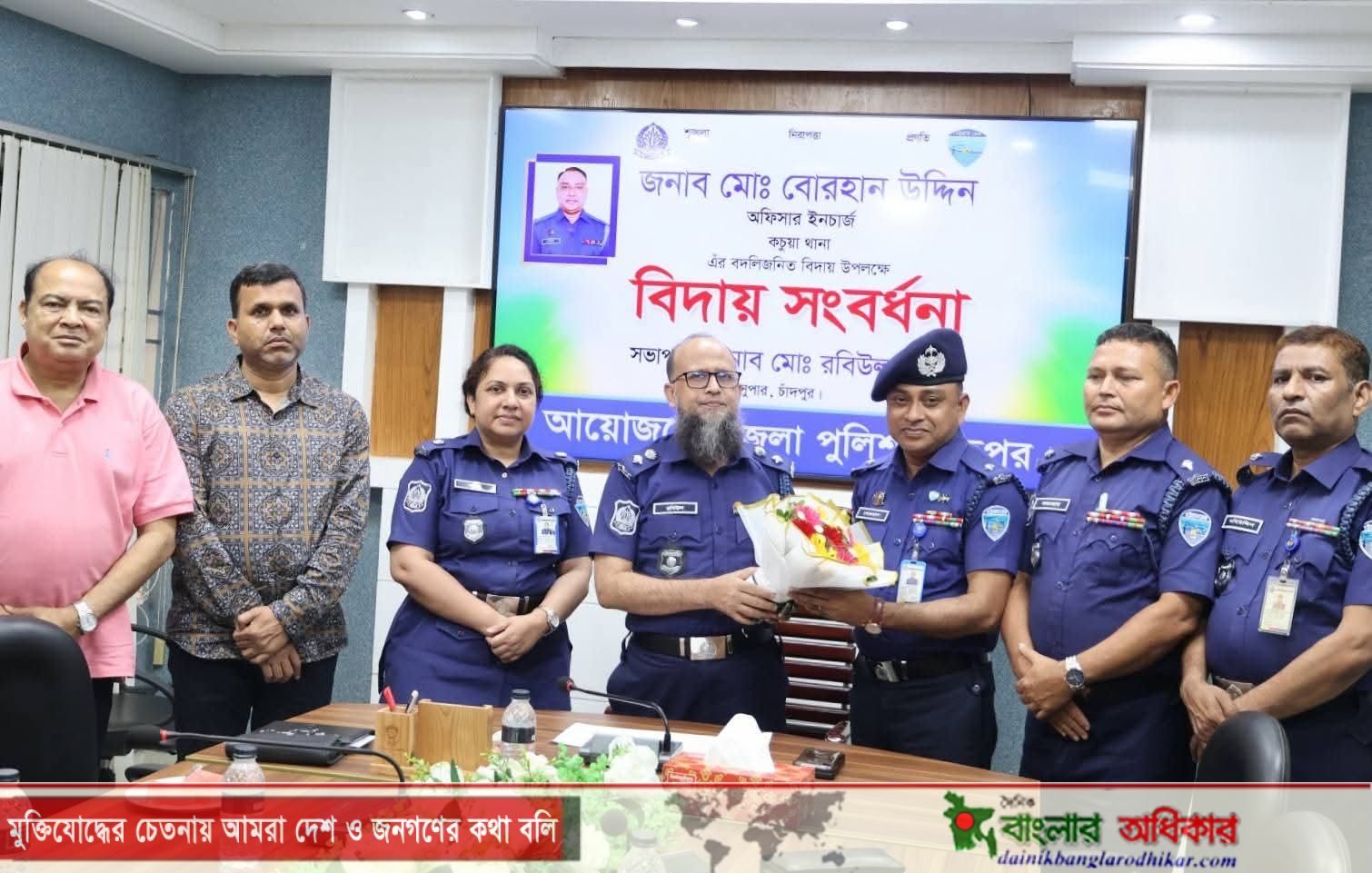 চাঁদপুর জেলা পুলিশের আয়োজনে গত রবিবার (১৯ এপ্রিল) সহকারী পুলিশ সুপার ও পুলিশ পরিদর্শক (নিরস্ত্র) কর্মকর্তাগণের বদলি উপলক্ষে জনাব নাদিরা নূর, অতিরিক্ত পুলিশ সুপার (প্রশাসন ও অর্থ), চাঁদপুর-এর সঞ্চালনায় এক বিদায় সংবর্ধনা অনুষ্ঠিত হয়। অনুষ্ঠানে সভাপতিত্ব করেন চাঁদপুর জেলার সম্মানিত পুলিশ সুপার জনাব মোঃ রবিউল হাসান (আইজি ব্যাজ ও শুদ্ধাচার পুরস্কারপ্রাপ্ত)।
