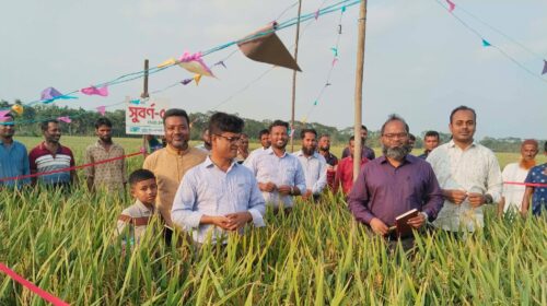 অনুষ্ঠানের শুরুতে আমন্ত্রিত অতিথিরা কৃষকদের সাথে নিয়ে সরেজমিনে রোপণকৃত ধানের জমি পর্যবেক্ষণ করেন। মাঠ পর্যায়ে দেখা যায়, প্রতিটি থোড়ে কার্যকর কুশির সংখ্যা গড়ে ১৭টি এবং শীষের গড় দৈর্ঘ্য সাড়ে ১১ সেন্টিমিটার। প্রতিটি শীষে পুষ্ট দানার সংখ্যা ৩১০ থেকে ৩৫০টি এবং দানায় কোনো প্রকার চিটা বা অপুষ্ট অংশ দেখা যায়নি।