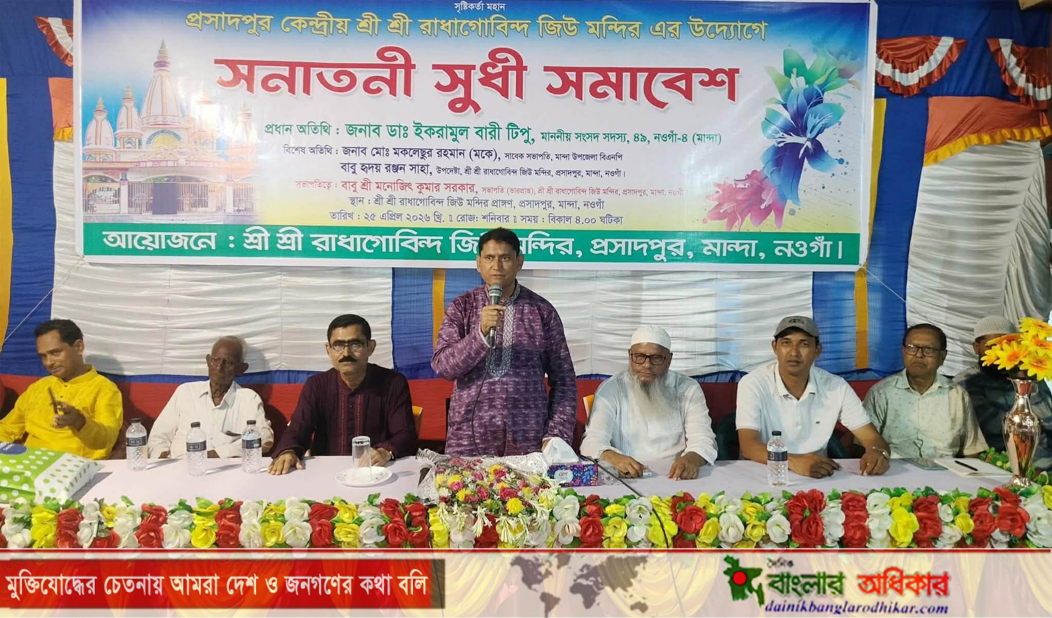 ​নওগাঁর মান্দা উপজেলায় সনাতন ধর্মাবলম্বীদের অংশগ্রহণে এক সুধী সমাবেশ অনুষ্ঠিত হয়েছে। আজ শনিবার (২৫ এপ্রিল) বিকেলে প্রসাদপুর রাধা-গোবিন্দ জিউ মন্দির প্রাঙ্গণে এই অনুষ্ঠানের আয়োজন করা হয়। সমাবেশে প্রধান অতিথি হিসেবে উপস্থিত ছিলেন স্থানীয় সংসদ সদস্য ডা. ইকরামুল বারী টিপু