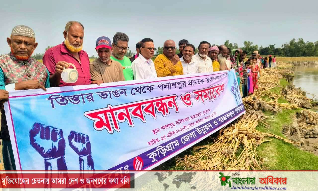 ​কুড়িগ্রামের রাজারহাটে তিস্তা নদীর অব্যাহত ভাঙনে দিশেহারা এলাকাবাসী। বসতভিটা ও আবাদি জমি হারানো ক্ষতিগ্রস্তদের ক্ষতিপূরণ প্রদান এবং নাজিমখান ইউনিয়নের পলাশপুর গ্রাম রক্ষার দাবিতে উত্তাল হয়ে উঠেছে নদীপাড়ের মানুষ। শনিবার (২৫ এপ্রিল) দুপুরে জেলা উন্নয়ন ও বাস্তবায়ন পরিষদের উদ্যোগে পলাশপুর এলাকায় এক বিশাল মানববন্ধন ও প্রতিবাদ সমাবেশ অনুষ্ঠিত হয়।