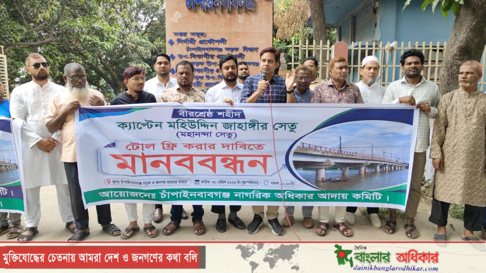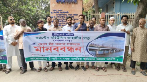 মাহিদুল ইসলাম ফরহাদ, চাঁপাইনবাবগঞ্জ: চাঁপাইনবাবগঞ্জের বীরশ্রেষ্ঠ শহীদ ক্যাপ্টেন মহিউদ্দিন জাহাঙ্গীর সেতু (মহানন্দা সেতু) টোলমুক্ত করার দাবিতে মানববন্ধন কর্মসূচি পালিত হয়েছে। দীর্ঘ ৩৩ বছর ধরে চলমান এই টোল আদায়কে সাধারণ মানুষের ওপর বাড়তি চাপ হিসেবে উল্লেখ করে অবিলম্বে তা বন্ধের দাবি জানানো হয়।