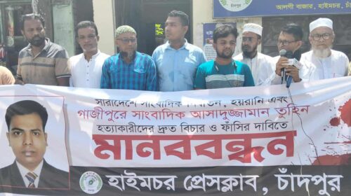 গাজীপুরে সাংবাদিক তুহিন হত্যাকারীদের ফাঁসির দাবিতে হাইমচর প্রেসক্লাবের মানববন্ধন