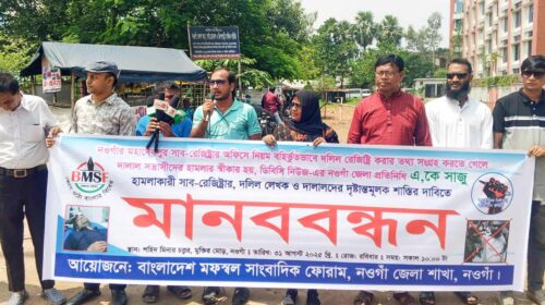 উজ্জ্বল কুমার নওগাঁ প্রতিনিধি: নওগাঁর মহাদেবপুর সাব-রেজিস্ট্রি অফিসে তথ্য সংগ্রহ করতে গিয়ে ডিবিসি নিউজের নওগাঁ জেলা প্রতিনিধি সাংবাদিক এ. কে. সাজুর ওপর সন্ত্রাসী হামলার প্রতিবাদে নওগাঁয় মানববন্ধন ও বিক্ষোভ…