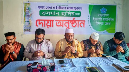 চাঁদপুর প্রতিনিধি: মোঃ রবিউল আজম সন্ত্রাসী হামলায় গুরুতর আহত ইনকিলাব মঞ্চের মুখপাত্র জনাব শরীফ ওসমান হাদী-এর দ্রুত সুস্থতা কামনায় বাংলাদেশ ইসলামী ছাত্রশিবির চাঁদপুর জেলা শাখার উদ্যোগে দোয়া মাহফিল অনুষ্ঠিত…