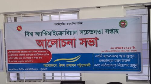 পটুয়াখালী প্রতিনিধিঃ পটুয়াখালী জেলা ঔষধ প্রশাসন অধিদপ্তরের আয়োজনে এবং প্রিস্টিন ফার্মাসিউটিক্যালস এর সহযোগিতায় বিশ্ব এন্টিমাইক্রোবিয়াল রেজিস্ট্যান্স সচেতনতা সপ্তাহ উপলক্ষে র্যালি ও সেমিনারের আয়োজন করা হয়েছে। শনিবার (২২ নভেম্বর) সকাল সাড়ে…